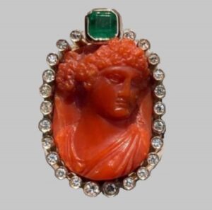 Nel primo anello il corallo antico rappresenta una donna e ne ho fatto un chevalier da mignolo chic e prezioso, nel secondo anello il corallo ha una corona di brillanti e un bellissimo smeraldo Colombiano carré.